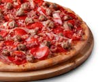 Signature red tomato sauce on our original crust, topped with mozzarella cheese, pepperoni, salami, Canadian bacon, smoked bacon, and Italian sausage.